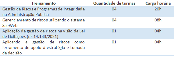 • Curso, no formato de oficinas práticas, com carga horária de 20 (vinte) horas, intitulado “Gestão de Riscos e Programas de Integridade na Administração Pública”;